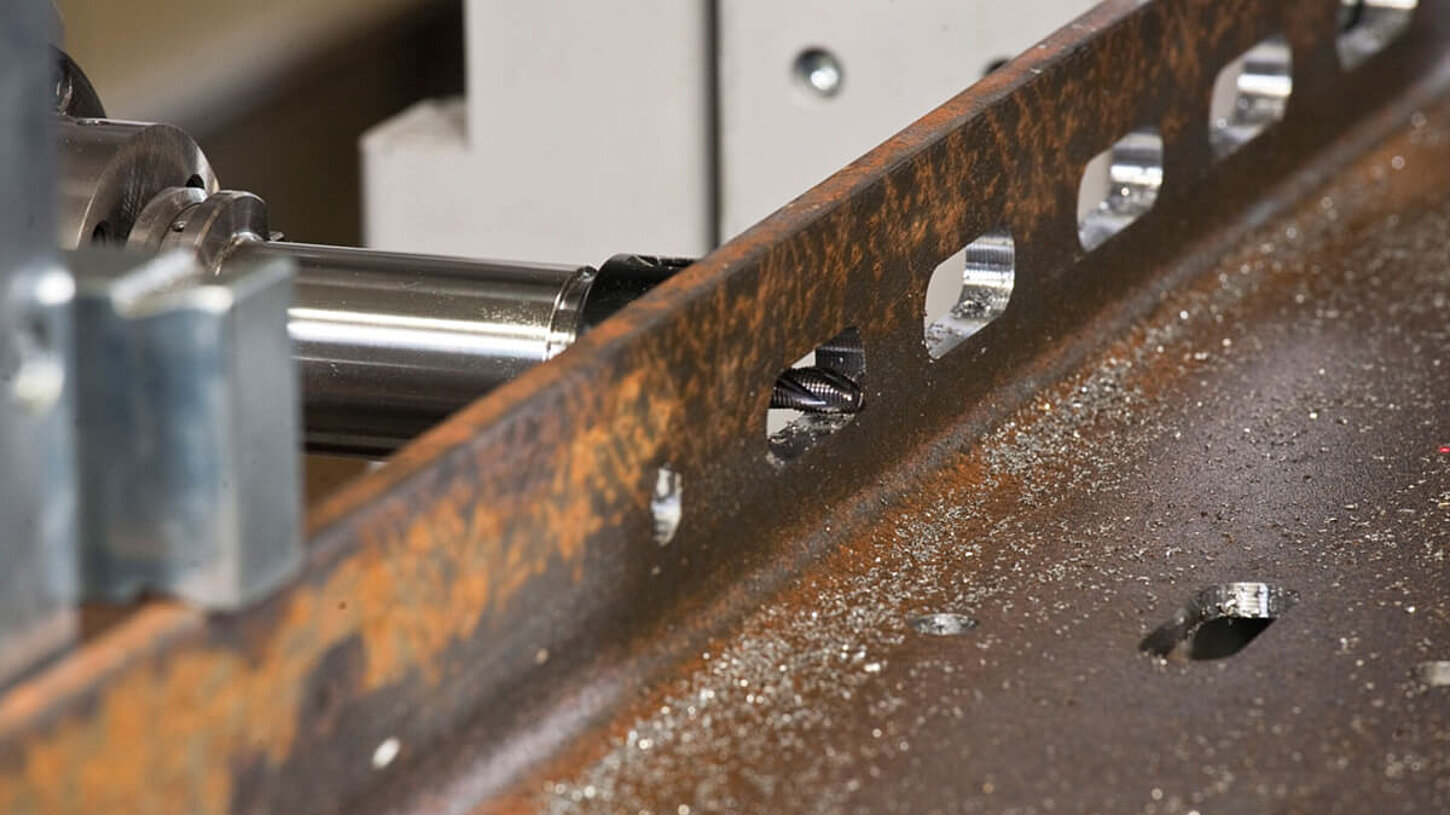 Jusqu’à 60% plus rapide qu’une machine de perçage traditionnelle grâce à la course additionnelle en X de 500 mm sur les 3 unités de perçage : ainsi, le perçage simultané est possible sur les ailes et dans l’âme à des positions différentes, ainsi que l’usinage en temps masqué pendant un sciage (selon dessins des pièces). Vitesse de rotation des broches jusqu’à 4000 tr/min combinée à un couple élevé pour un perçage carbure hautes performances et jusqu’au diamètre 50 mm.