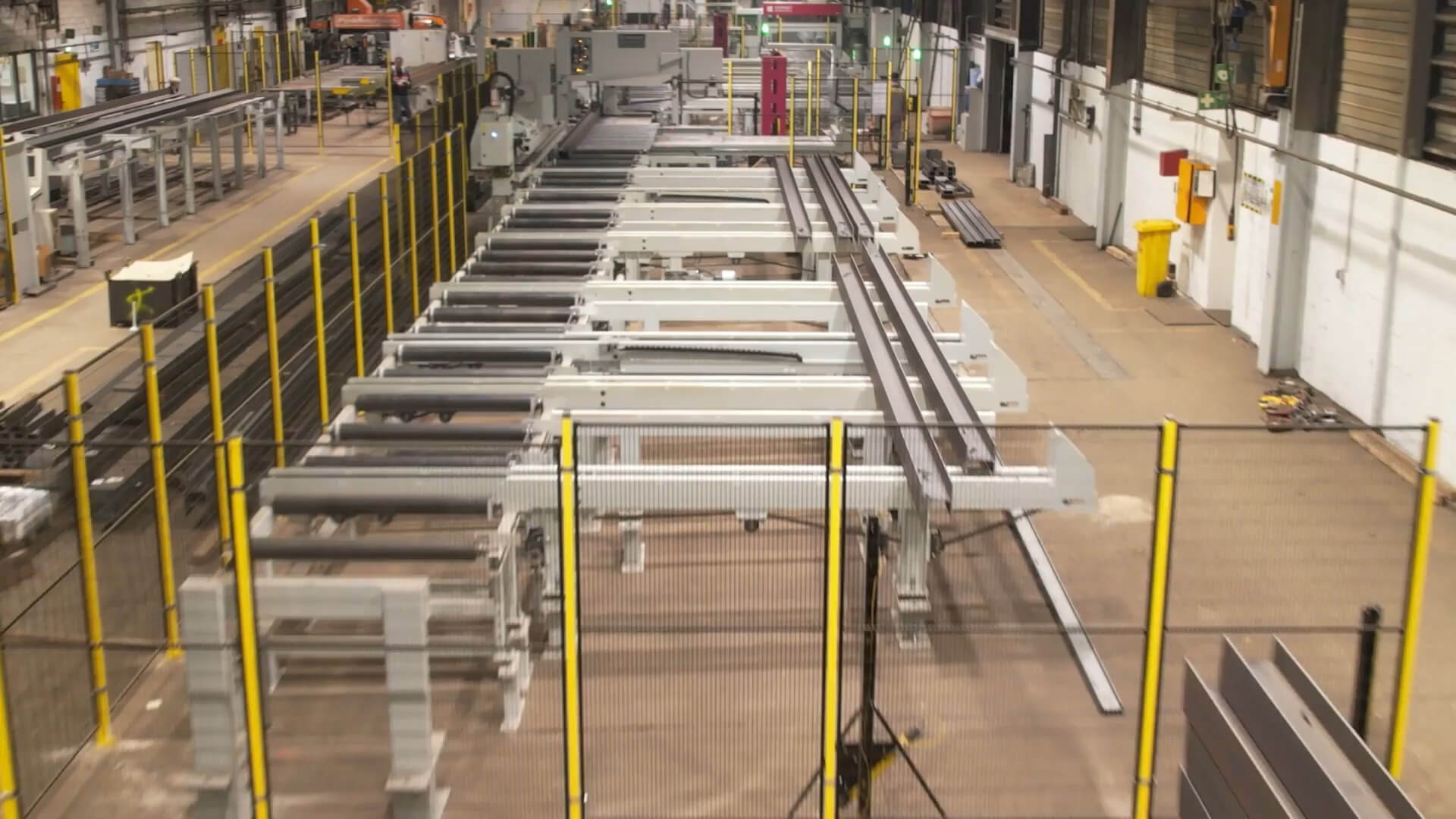 The raw material is delivered by lorry and temporarily stored outside. The overhead crane is used to load the 20 metre long beams and profiles onto the fully automated processing line.